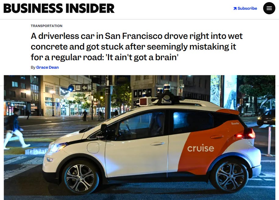 אבל, בו זמנית שהפנס שלנו מאיר על הטוב שבמהפכה ההדרגתית בשוק הרכב, הוא גם מטיל צל שמסתיר את הבעיות החדשות שהמהפכה הזו תביא איתה. רכבים אוטונומיים משמעו רכבים שגם נוסעים ללא כל נהג, ומה קורה כאשר אין נהג אנושי ברכב? כך, באוגוסט 2023, נתקעה מכונית אוטונומית במלט שהיה בשלבי התייבשות על כביש בסן פרנסיסקו, כי היא לא זיהתה את השילוט שסימן שיש שם מלט טרי. המכוניות הללו מאד רגישות לשילוט, ופחות למציאות הפיזית שסביבן.